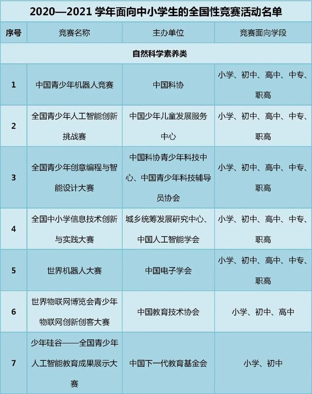 日前,教育部公布了2020-2021学年面向中小学生的全国性竞赛活动名单,名单分为“自然科学素养类”“人文综合素养类”“艺术体育类”三类,共有“中国青少年机器人竞赛”等35项竞赛进入名单。