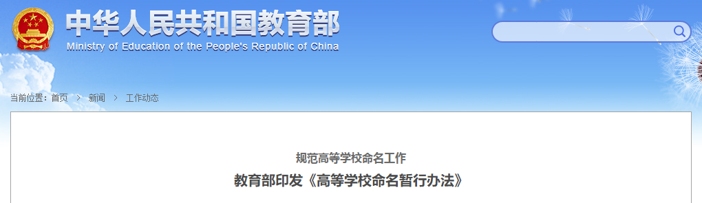 日前,为进一步规范高等学校命名工作,依据相关法律法规规定,结合高校设置工作实际,教育部研究制定了《高等学校命名暂行办法》(简称《暂行办法》)并正式印发。《暂行办法》适用于发布之后的全日制大学、独立设置的学院、高等职业学校(含本科层次职业学校和专科层次职业学校)以及高等专科学校的命名事项。