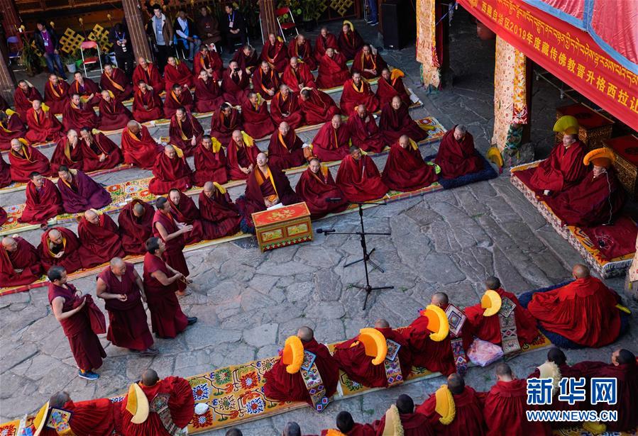 这是4月26日拍摄的格西拉让巴学位授予仪式上激烈的辩经场景。 当日,西藏自治区2019年度藏传佛教学经僧人考核晋升格西拉让巴学位立宗答辩暨颁证仪式在拉萨大昭寺举行,来自藏传佛教格鲁派主要寺院的12名高僧获得格西拉让巴学位。格西,藏语意为“善知识”,为藏传佛教显宗最高学衔。 新华社记者 普布扎西 摄
