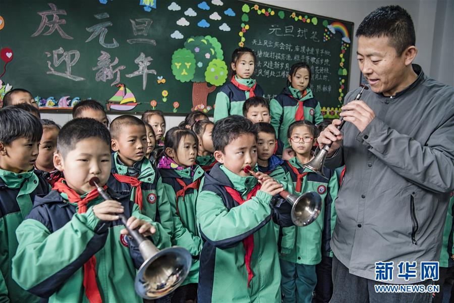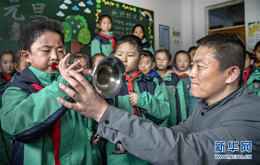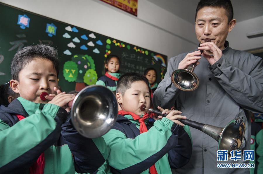 12月17日,志丹县文化艺术培训中心唢呐演奏员贾鹏程(右一)在城关小学传授唢呐技艺。新华社记者 陶明 摄