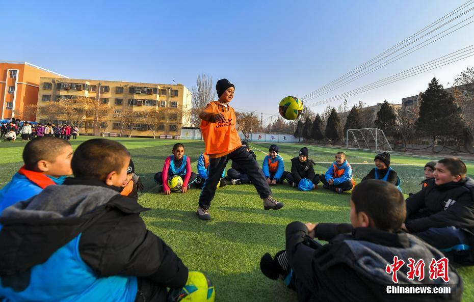 12月18日,新疆疏附县明德小学足球场上,校园足球队员练习颠球。中新社记者 刘新 摄