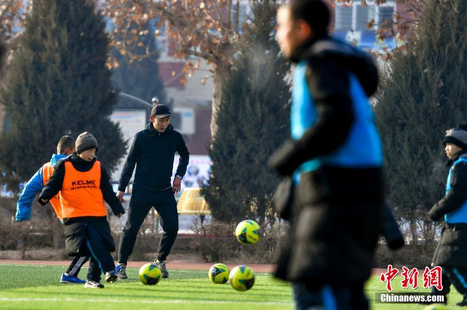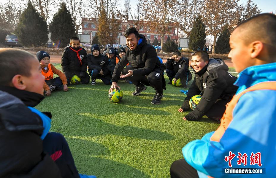 12月18日,来自广州市启慧学校的援疆老师徐均猛在新疆疏附县明德小学足球场上带领学生们训练。中新社记者 刘新 摄