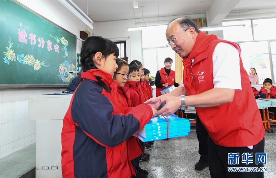 12月19日,小学生志愿者接过全国劳模、全国最美志愿者钱海军(右一)赠送的正能量书籍。新华社记者 徐昱 摄