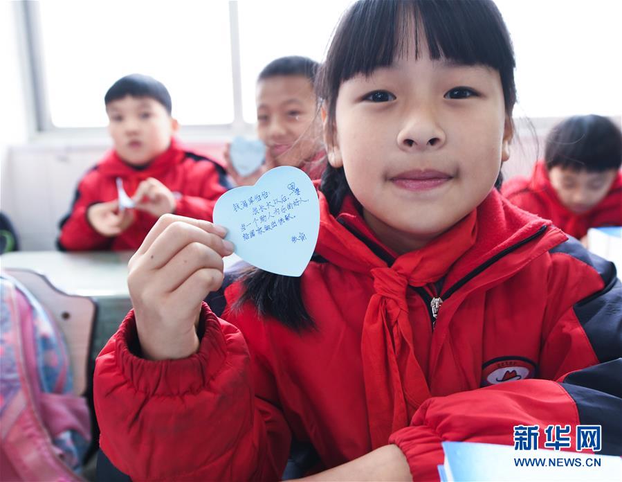 12月19日,小学生志愿者把自己对志愿服务的感悟写在纸上。 新华社记者 徐昱 摄