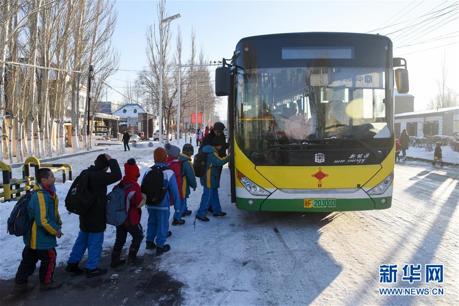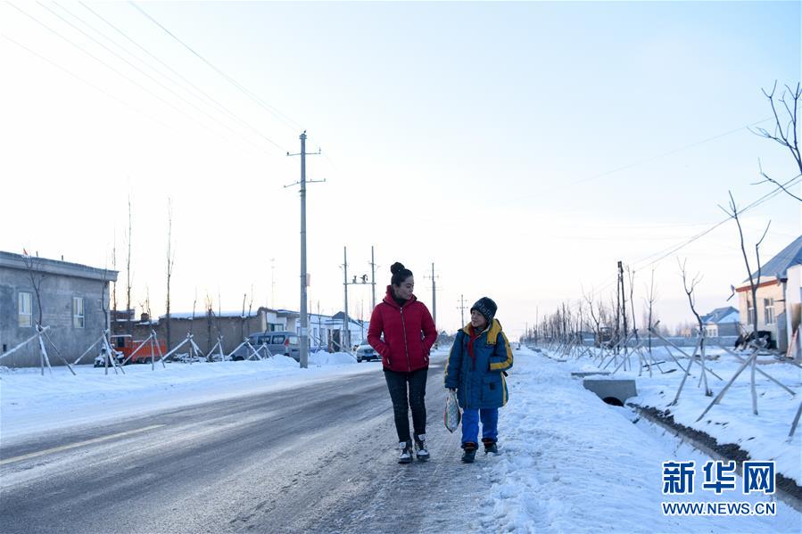 新疆伊犁哈萨克自治州察布查尔锡伯自治县海努克乡阿热吾斯塘村小学学生祖拜尔·阿力木江下了“校车专线”和自己的母亲一同回家(12月18日摄)。 新华社记者 丁磊 摄