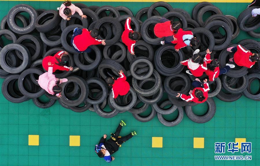 12月31日,融安县遂融幼儿园的孩子们在户外进行“障碍越野训练”(无人机照片)。新华社记者 黄孝邦 摄