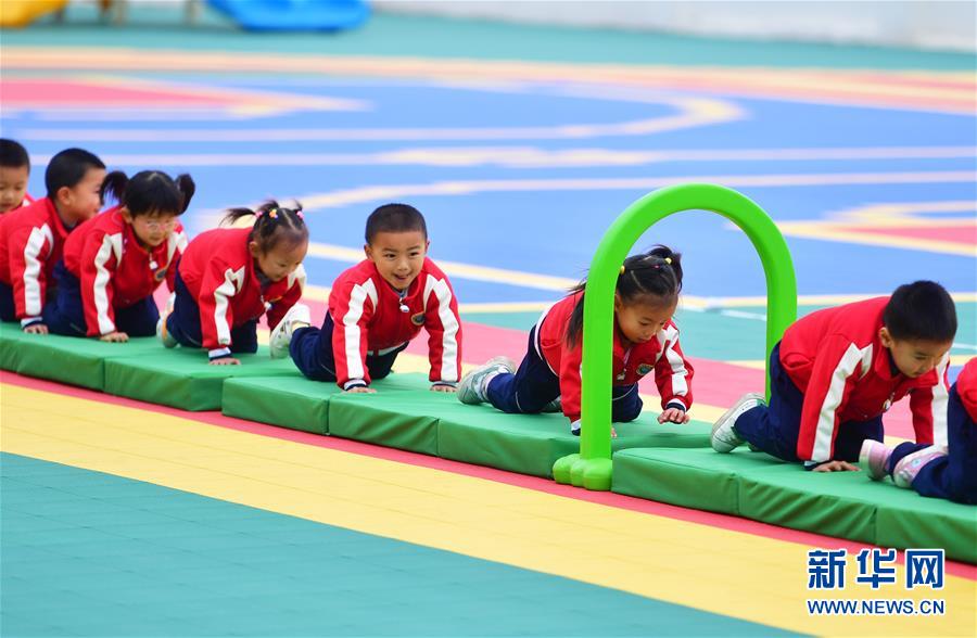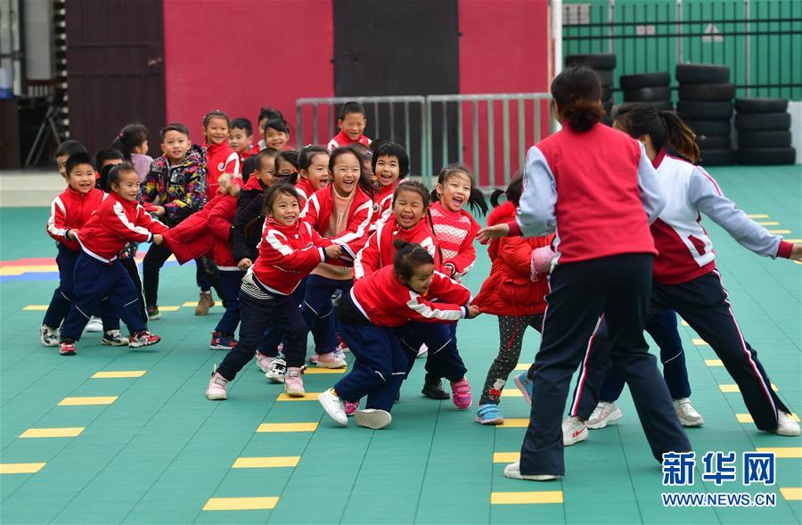 12月31日,融安县遂融幼儿园的孩子们和老师在户外做游戏。新华社记者 黄孝邦 摄