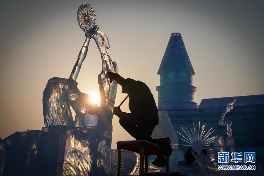 1月2日,选手在哈尔滨冰雪大世界内制作冰雕。新华社记者 王松 摄