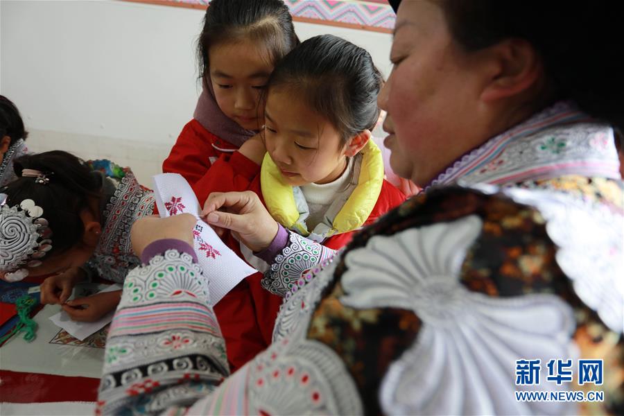1月4日,贵州省毕节市黔西县林泉镇高锦村的村民杨琼(右)指导孩子们学习刺绣。 进入寒假,贵州省毕节市黔西县第一小学的10余名小学生在老师的带领下来到该县刺绣之乡林泉镇高锦村进行社会实践,“零距离”体验传统技艺,感受传统文化的魅力。 新华社发(周训超 摄)