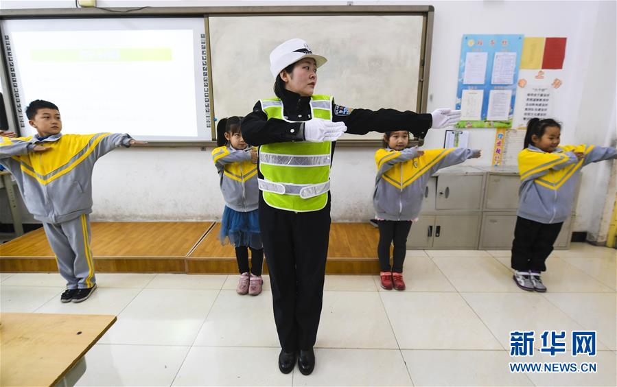 1月6日,在河北省大厂回族自治县城区第二小学,交警向学生讲解交通手势含义。 寒假临近,河北省大厂回族自治县组织开展“关注安全 护苗成长”交通安全主题教育活动,让孩子们从小养成良好的交通出行习惯,确保学生安全度寒假。 新华社记者 李晓果 摄