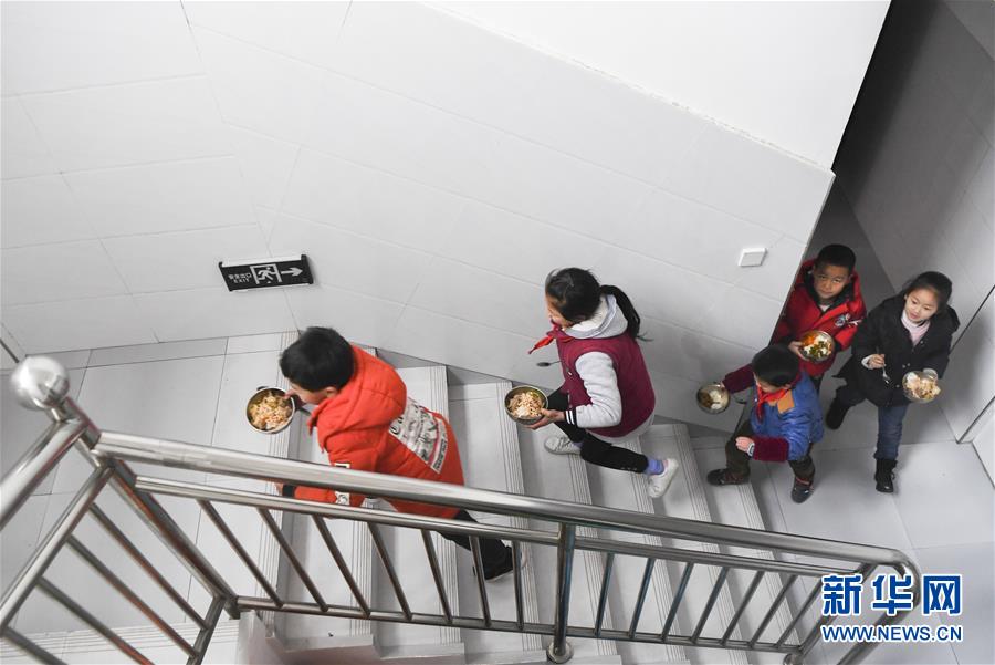 1月10日,重庆市石柱土家族自治县中益乡小学学生打好饭菜后前往食堂二楼用餐。 2019年下半年,重庆市石柱土家族自治县中益乡小学对校园食堂进行改造。改造后的中益乡小学食堂扩建至两层,就餐环境得到有效改善。同时,学校还通过食材来源可追溯、食品留样、优化菜品组合等举措,确保孩子们吃上放心、健康的营养餐。 目前,重庆市石柱县已实现“农村义务教育学生营养改善计划”全覆盖。 新华社记者王全超摄