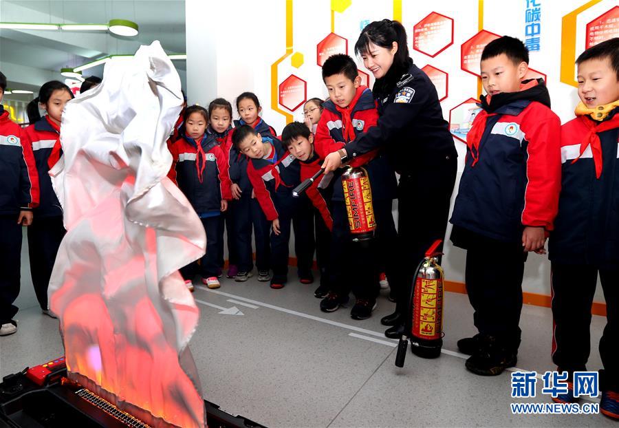 1月10日,上海市公安局普陀分局真如派出所民警周珊珊利用电子模拟起火装置和电子灭火器,向普陀区明翔实验小学的学生讲解如何灭火。 当日,上海市公安局普陀分局真如派出所在寒假前走进辖区中小学校,为学生们讲解安全知识,开展防诈骗、防盗窃宣传,让孩子们度过一个平安的寒假。 新华社记者凡军摄