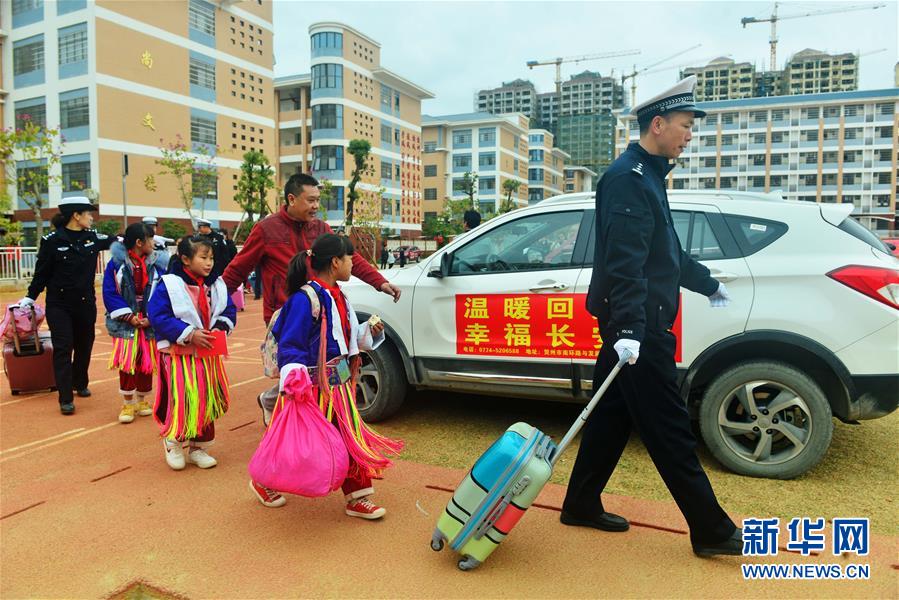 1月11日,在贺州市平桂区文华学校,土瑶班学生在交警和爱心人士的带领下准备乘坐爱心车辆回家。 新华社发(黄旭胡 摄)