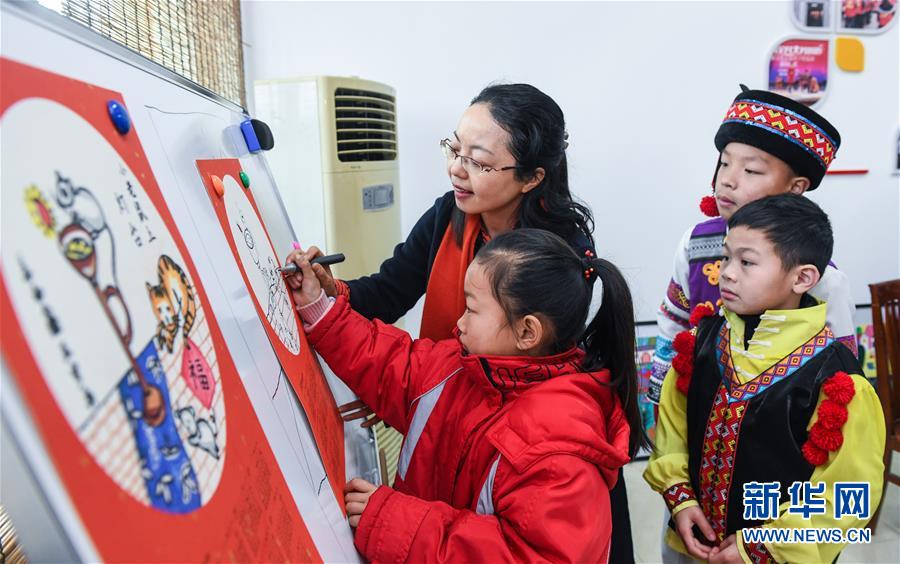 1月13日,两名壮族小学生(右一、右二)和同学在农民画画家朱碧云的指导下学画农民画。 新华社记者 徐昱 摄