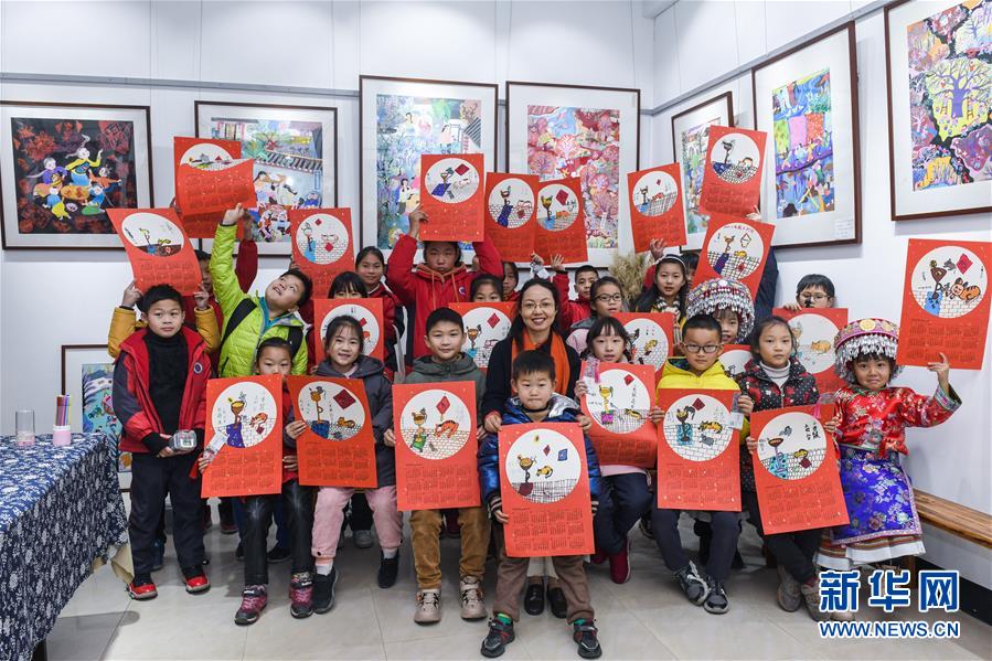 1月13日,小学生们展示自己创作的以新年为主题的农民画。新华社记者 徐昱 摄