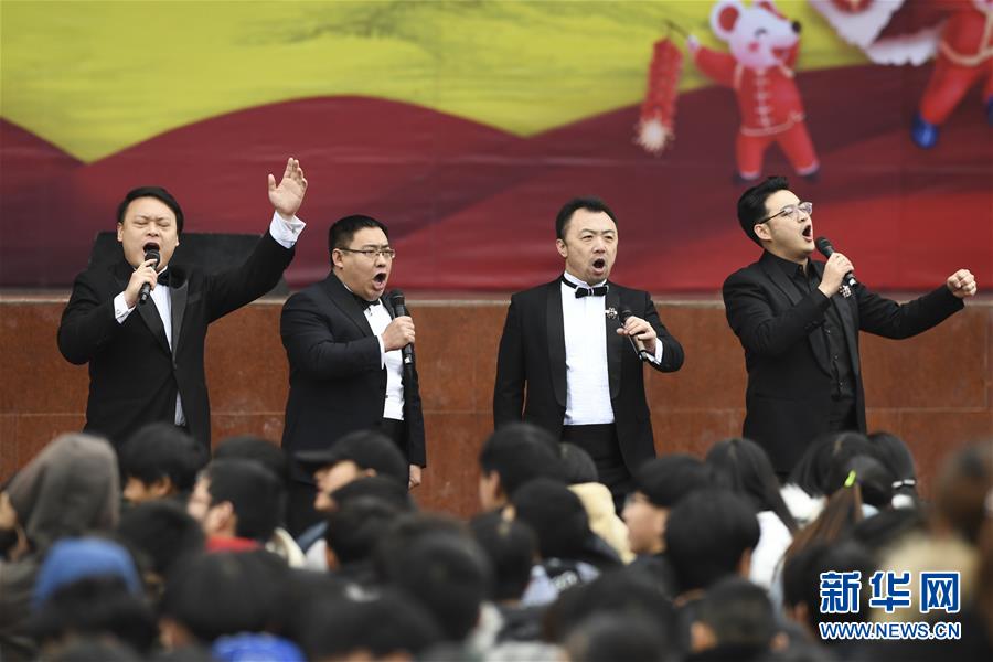 1月15日,中央歌剧院的歌唱家们在慰问演出中表演男声四重唱。 当日,“我们的中国梦”——文化进万家中央歌剧院文艺小分队来到重庆市石柱土家族自治县第一职业学校进行慰问演出,为学校的三千多名师生带来了一场精彩的音乐大餐。 新华社记者 王全超 摄