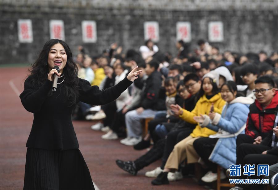 1月15日,中央歌剧院女高音歌唱家蔡楠在慰问演出中演唱。 当日,“我们的中国梦”——文化进万家中央歌剧院文艺小分队来到重庆市石柱土家族自治县第一职业学校进行慰问演出,为学校的三千多名师生带来了一场精彩的音乐大餐。 新华社记者 王全超 摄