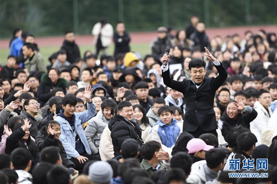 1月15日,中央歌剧院男中音歌唱家王艺清在慰问演出中与观众互动。 当日,“我们的中国梦”——文化进万家中央歌剧院文艺小分队来到重庆市石柱土家族自治县第一职业学校进行慰问演出,为学校的三千多名师生带来了一场精彩的音乐大餐。 新华社记者 王全超 摄