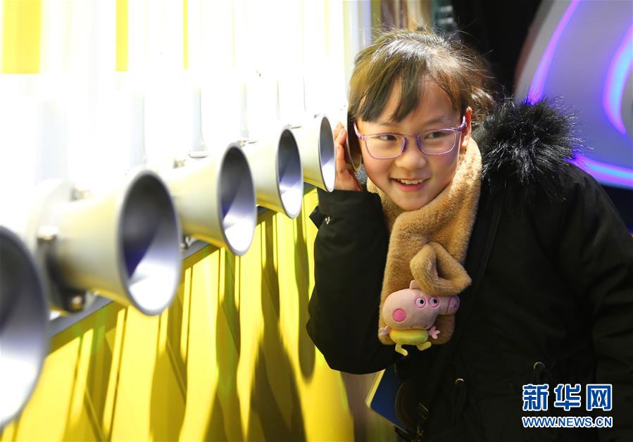 1月15日,小朋友在宝丰科技馆科普乐园里体验回音筒。新华社发(王双正 摄)
