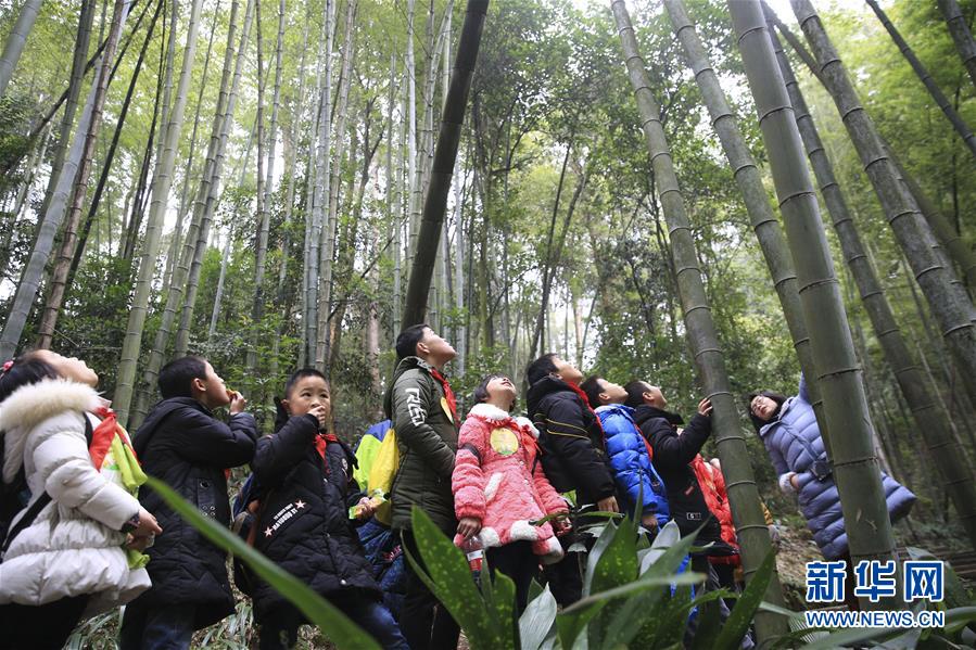 1月16日,在重庆市北碚区缙云山,老师给孩子们讲解楠竹生长知识。 寒假临近,重庆市北碚区组织20名留守儿童、困境儿童走进重庆缙云山开展新春关爱研学活动,孩子们在青山绿水间亲近大自然,认知植物多样性,探索植物生长环境,快乐迎寒假。 新华社发(秦廷富 摄)