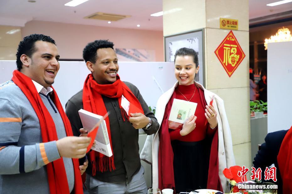 1月17日,正值中国农历腊月二十三,俗称“小年”,天津大学校领导与留校学生欢聚一堂,听相声、吃饺子、发红包,给近200名中外师生送来新春祝福,共同迎接农历庚子年的到来。图为天津大学留学生展示校领导发放的红包和书籍。 中新社记者 张道正 摄