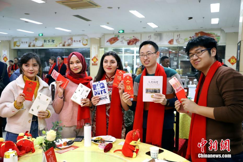 1月17日,正值中国农历腊月二十三,俗称“小年”,天津大学校领导与留校学生欢聚一堂,听相声、吃饺子、发红包,给近200名中外师生送来新春祝福,共同迎接农历庚子年的到来。图为天津大学学生展示校领导发放的红包和书籍。 中新社记者 张道正 摄