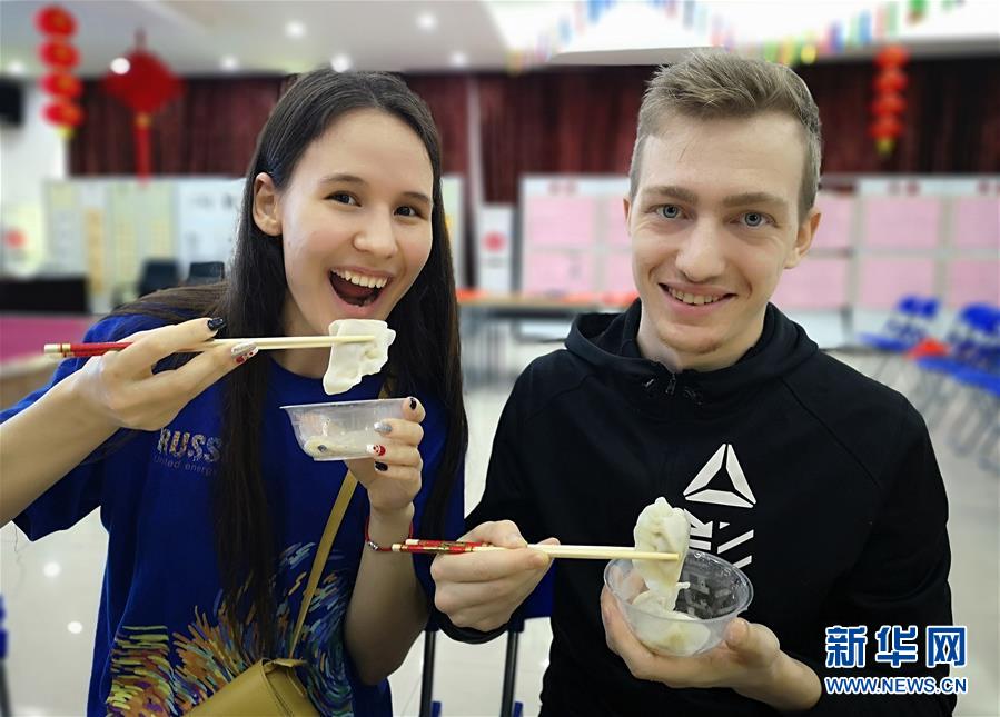 1月22日,海南大学的留学生吃上了自己包的饺子。新华社记者郭程摄