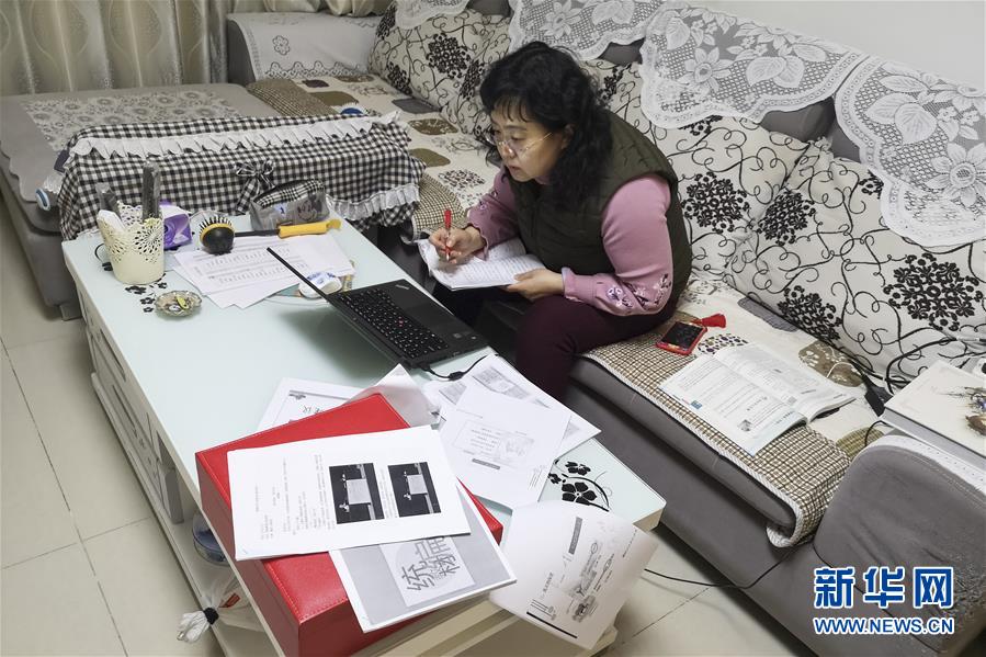 2月12日,北京中关村第三小学语文老师杨霞在家中做教材分析,为即将开始的学校网上教研做准备。新华社发