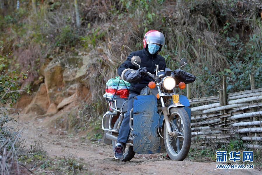 2月17日,在江西省万载县高村镇新竹村,罗长石在山路上骑行,他要赶去村里最偏远的村组给孩子们送下载的课程。 新华社记者 彭昭之 摄