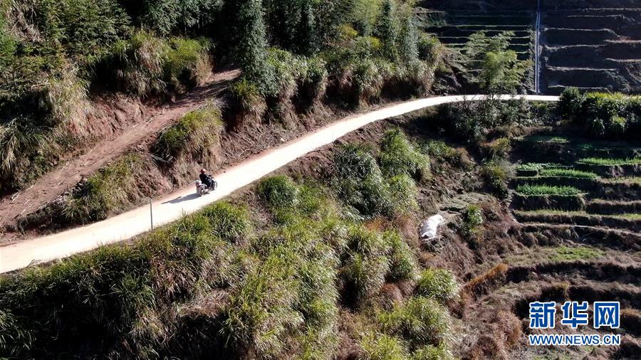 2月17日,在江西省万载县高村镇新竹村,罗长石骑行在山路上,他要去最偏远的村组,给孩子们送当天的线上教学课程(无人机照片)。 新华社记者 彭昭之 摄