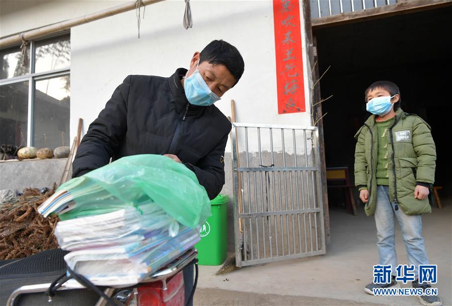 在江西省万载县高村镇新竹村尹家岭村组,罗长石在给读小学四年级的学生郭仕钱送来当天的线上教学课程和新学期的书本(2月17日摄)。 新华社记者 彭昭之 摄