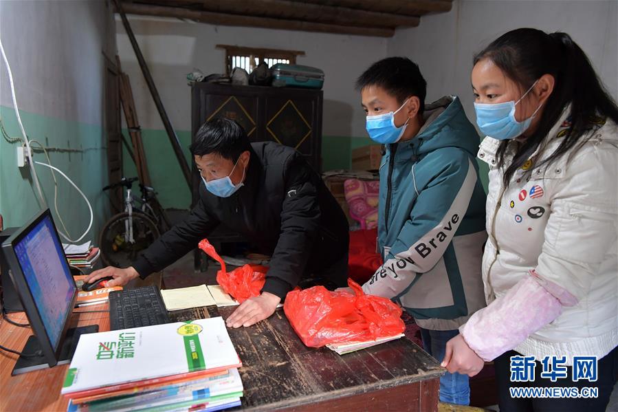 2月17日,在江西省万载县高村镇新竹村尹家岭村组,罗长石(左)在给今年读初三的郭台烽和他的同学郭小芳拷贝当天的线上教学课程。 新华社记者 彭昭之 摄