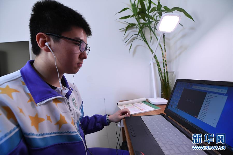 2月24日,东北师范大学附属中学学生徐铭君在家里收听线上直播课。 当日,吉林省全面启动网上教学,通过互联网、电视、家庭电脑和智能终端等,开展在线授课(听课)、资源点播和线上辅导、讨论、答疑等教育教学活动。 新华社发(颜麟蕴摄)