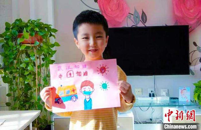 六岁的杨皓博上幼儿园大班,巴州森林消防支队一级消防士杨培的儿子,绘画为战疫情助力。。 孙康康 摄