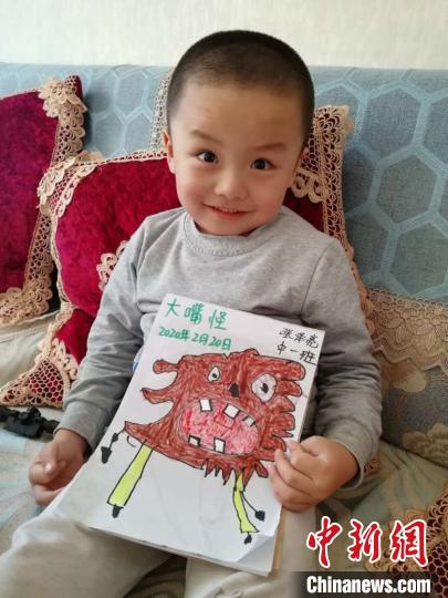 4岁张泽亮上幼儿园中班,巴州森林消防支队三级指挥员张凯的儿子,绘画为战疫情助力。 孙康康 摄