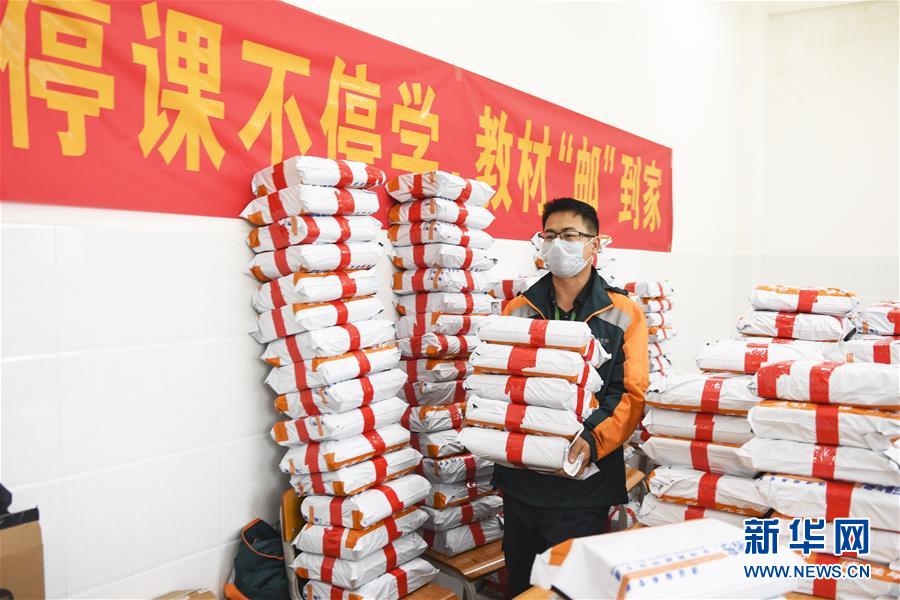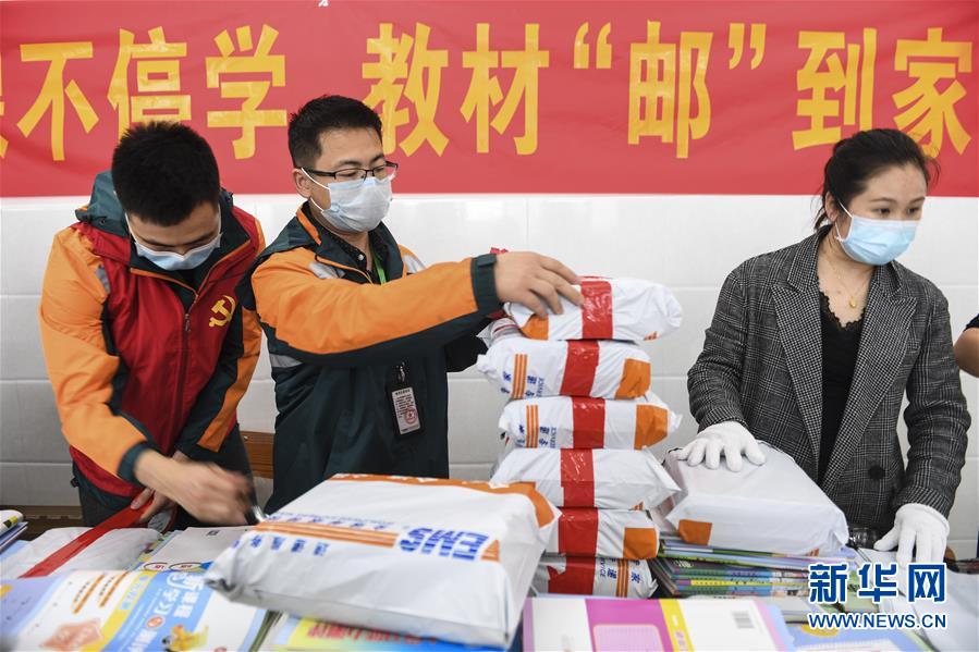 3月3日,广西南宁市邮政部门的工作人员在南宁市壮锦初级中学与学校老师一起分装学习资料。 近期,广西邮政部门在做好新冠肺炎疫情防控工作的同时,主动优化快递收揽、派送流程,降低配送费用、与中小学校对接,将新学期的学习资料及时邮寄到学生手中。 截至3月2日,广西邮政部门已为全自治区14个市60多所中小学校的7.9万名在校学生配送了教材和教辅类书籍。 新华社记者 曹祎铭 摄