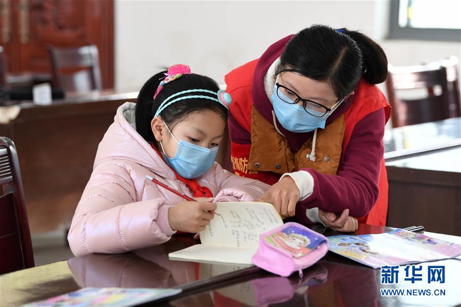 3月4日,志愿者在上派镇大墙村村委会会议室内辅导汪雪梅。新华社记者 刘军喜 摄