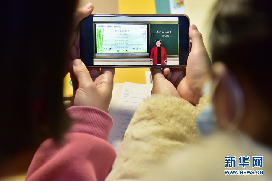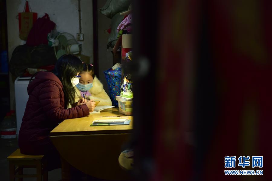 李小苒的邻居鲁小花(左)每天用自己的手机帮助李小苒进行线上学习(3月3日摄)。新华社发(葛宜年 摄)