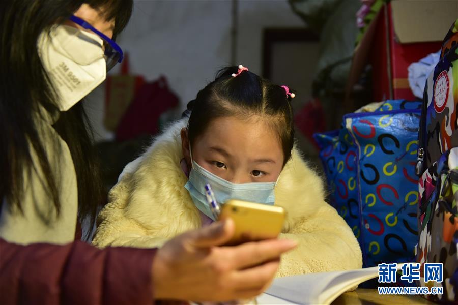 合肥市十里庙小学三一班班主任王传华(左)定期到李小苒家对她进行线下辅导(3月3日摄)。 新华社发(葛宜年 摄)