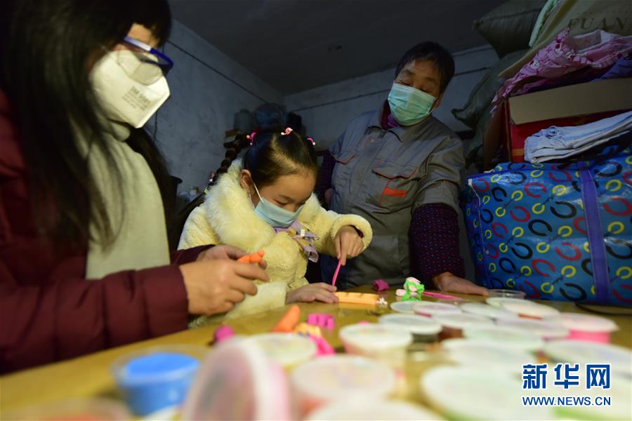 3月3日,合肥市十里庙小学三一班班主任王传华(左)与李小苒一起做手工,李小苒的奶奶在一旁观看。新华社发(葛宜年 摄)