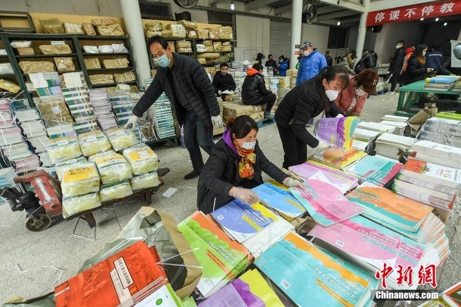 3月5日,山西新华书店集团太原有限公司教材发行中心一片忙碌,工作人员正在加紧分类打包准备快递的课本教材。疫情防控期间,当地教育部门采取由新华书店或学校快递寄送的方式,为40万中小学生发放新学期的教材和教辅材料。 中新社记者 武俊杰 摄