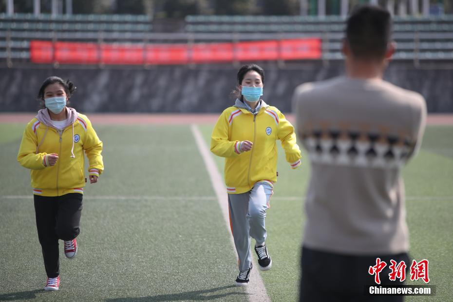 高三学生在操场戴口罩上体育课。中新社记者 瞿宏伦 摄