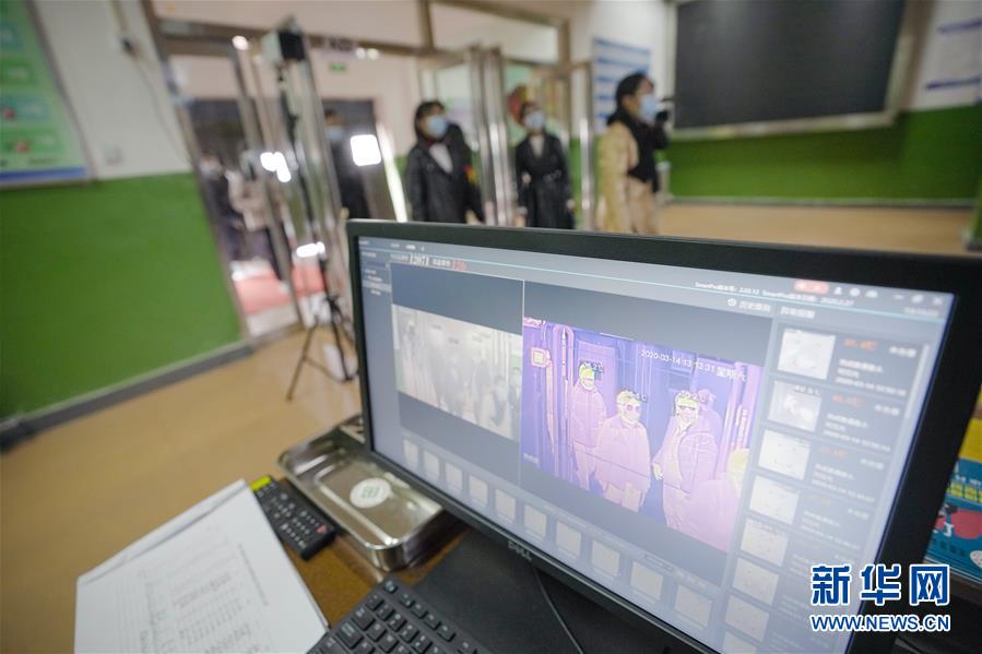3月14日,在青海省海北藏族自治州第一高级中学教学楼入口处,学生依次通过体温监测仪。新华社记者 吴刚 摄