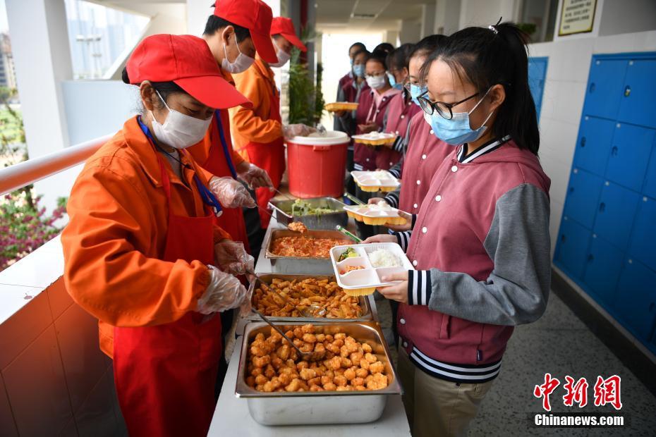 3月23日,云南省昆明市第一中学西山学校初三年级的学生在教室门口排队领餐。该校采取多种措施保障学生安全上课并有充足的体育锻炼时间,还进行新型冠状病毒防治测验,增强学生对新冠病毒的了解,提升防范意识。当天,云南省初三和高三年级正式开学。中新社记者 刘冉阳 摄