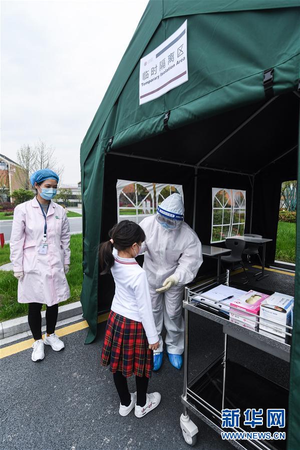 3月26日,在人大附中杭州学校防疫演练中,医护人员在临时隔离区对体温“异常”的学生进行二次测温。位于杭州余杭中泰街道的人大附中杭州学校当日举行校园防疫演练,包含学生入校园、入班级的各项步骤,以及班级里发生体温异常的应急方案、学校隔离点的处理等,检测学校一系列防疫应急预案的有效性和可行性。 新华社记者 徐昱 摄