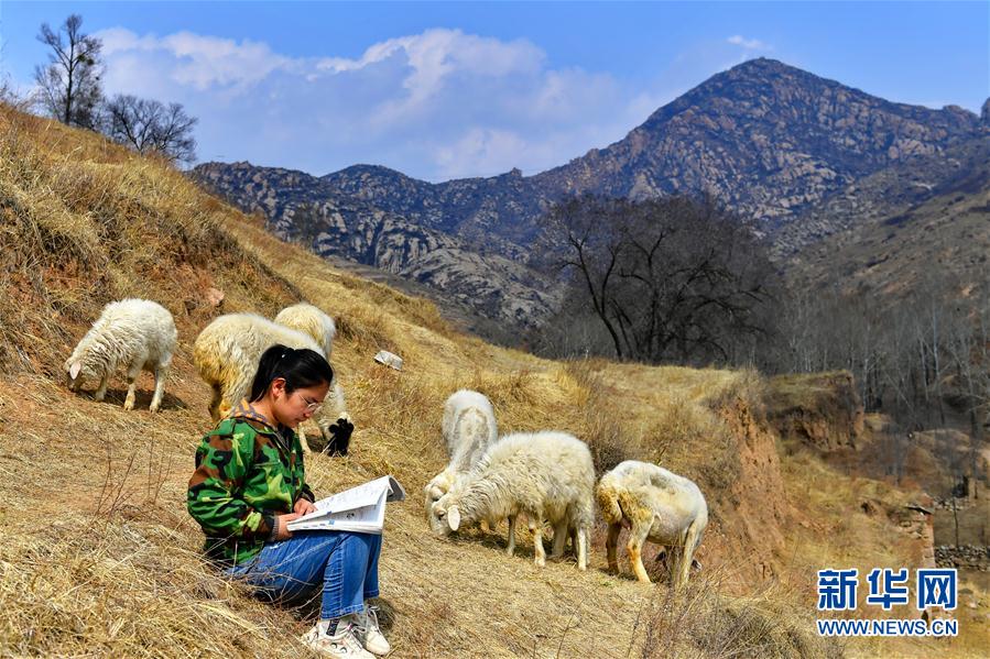 李彦昀在静乐县新开岭村的山坡上一边放羊一边复习功课(3月24日摄)。 新华社记者 曹阳 摄