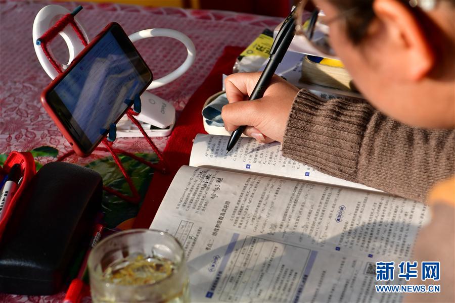 李彦昀在静乐县新开岭村的家里跟着网课学习(3月23日摄)。 新华社记者 曹阳 摄