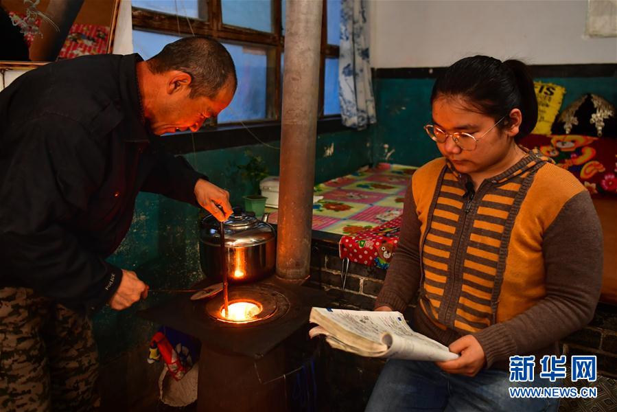 李彦昀(右)在静乐县新开岭村的家里一边烤火一边复习(3月23日摄)。 新华社记者 曹阳 摄