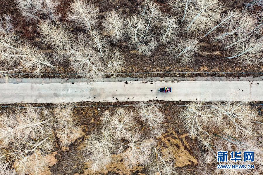 3月25日,李彦昀一家人坐着电动车前往校车接送站点(无人机照片)。新华社记者 曹阳 摄
