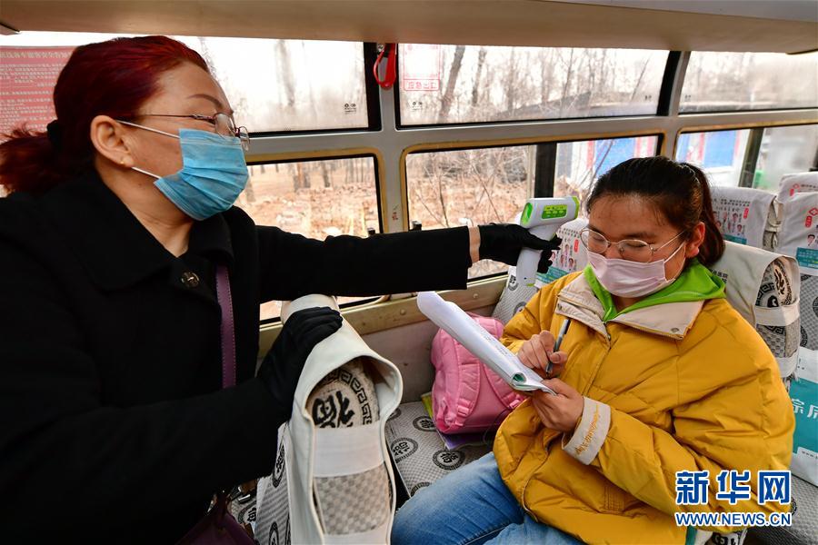 山西省静乐县第一中学校车上的工作人员在给李彦昀(右)测量体温(3月25日摄)。 新华社记者 曹阳 摄